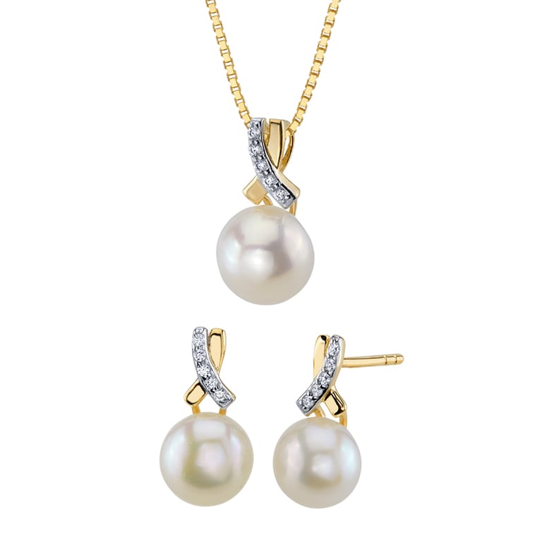 • ein Schmuckset, das auf den ersten Blick mit runden Perlen, Gold in Bicolor und weißen Zirkonen verzaubert
