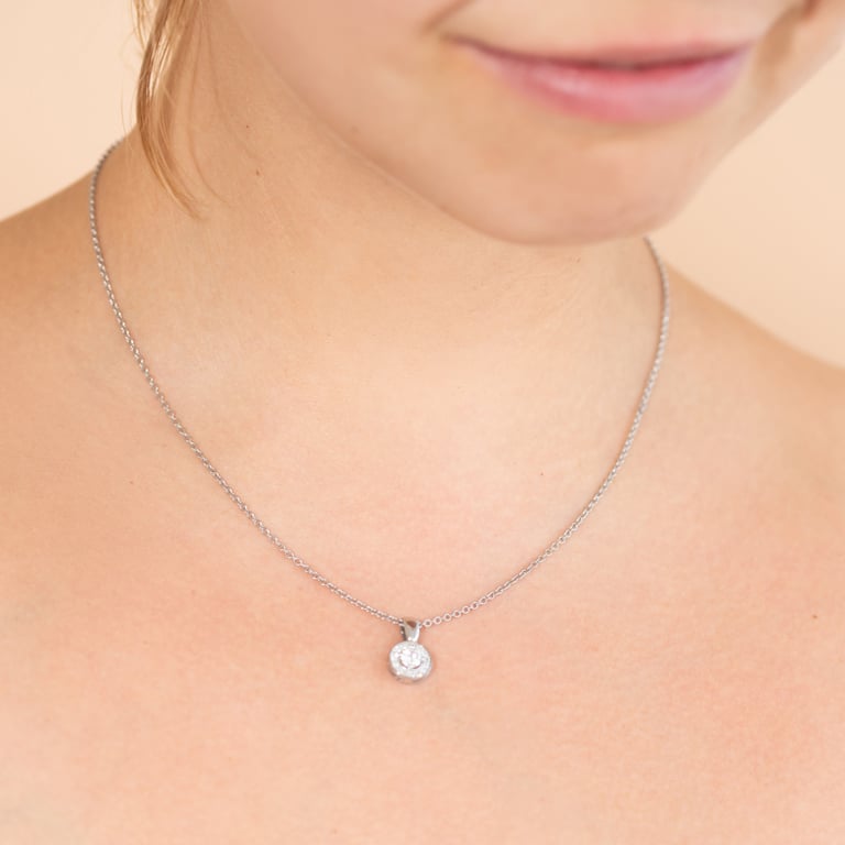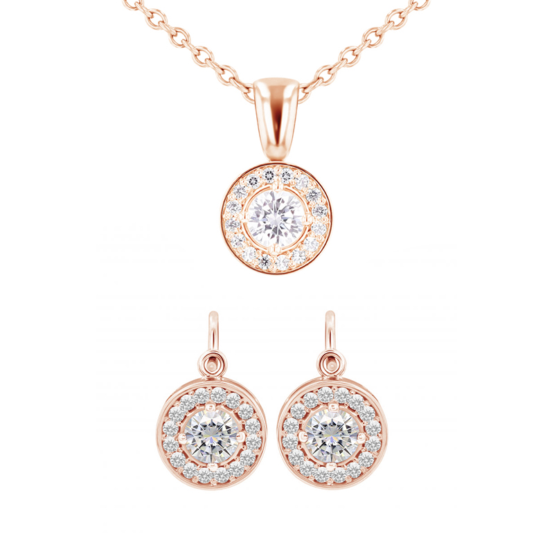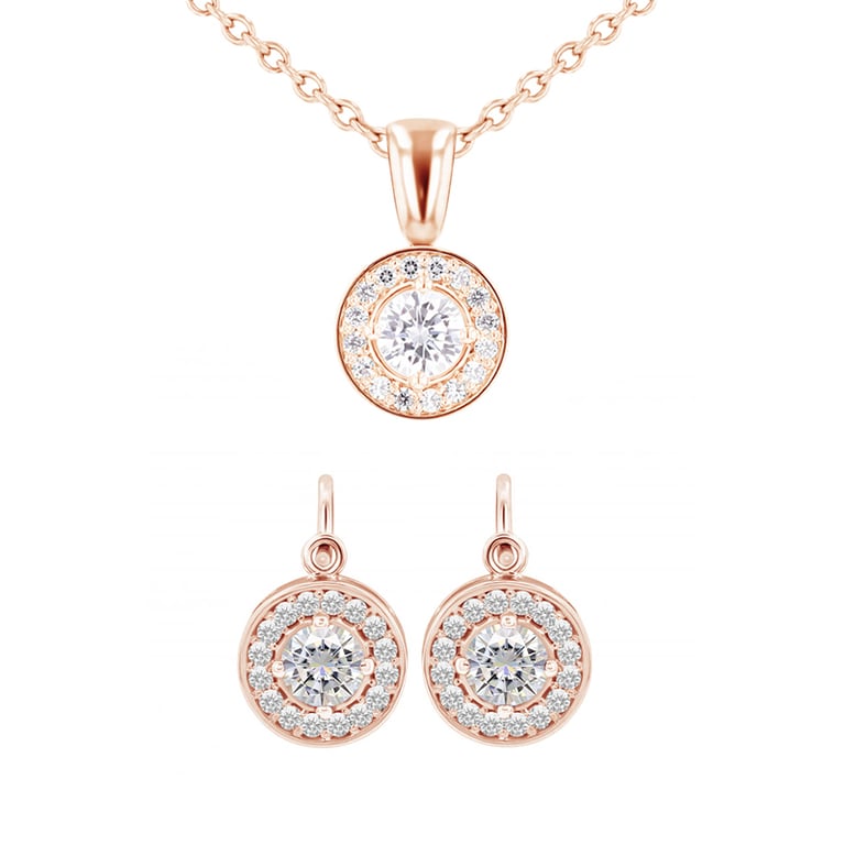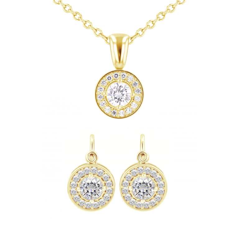 • ein funkelndes Set aus Anhänger und Ohrringen im Halo-Stil
