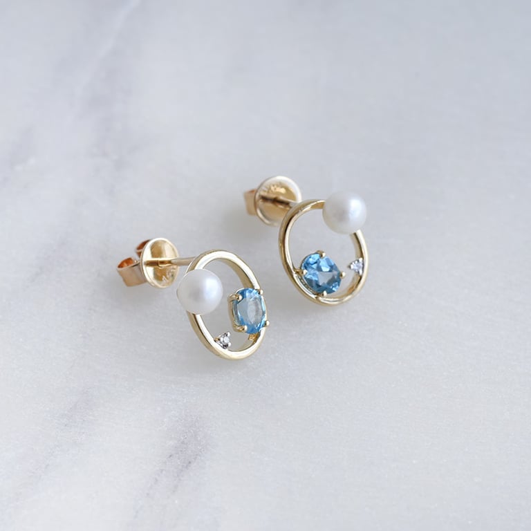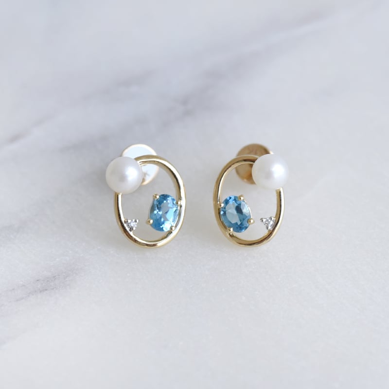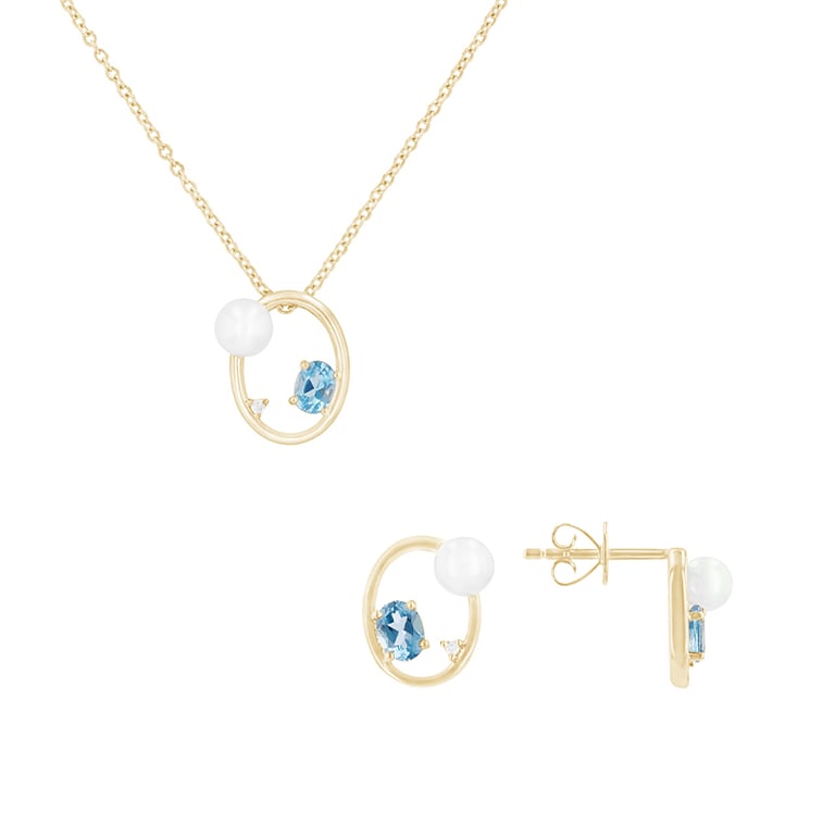 • Perlen, blaue Schweizer Topase und Diamanten zeichnen diesen minimalistischen Schmuck aus