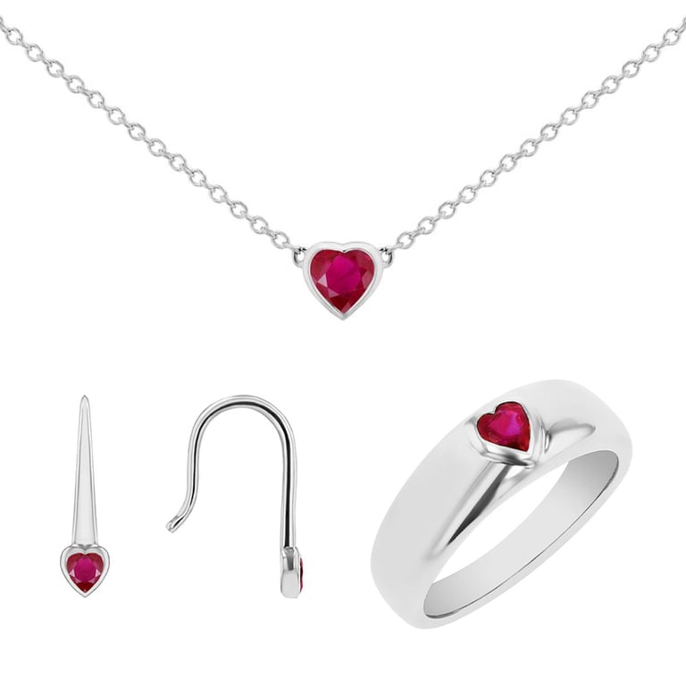 • Set aus Hängeohringen, Kette und Ring, die alle ein Rubinherz vereint