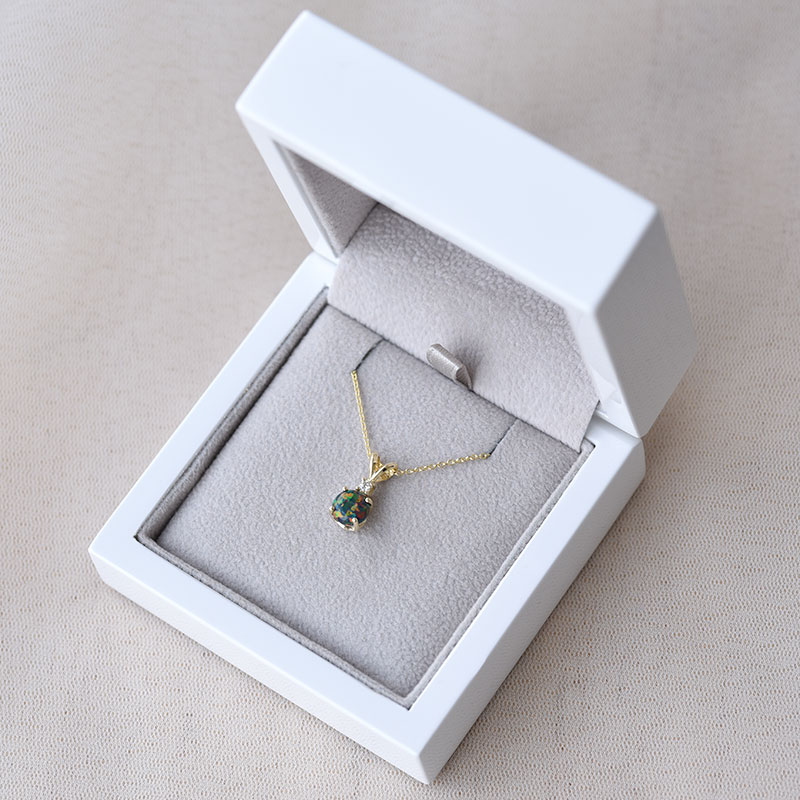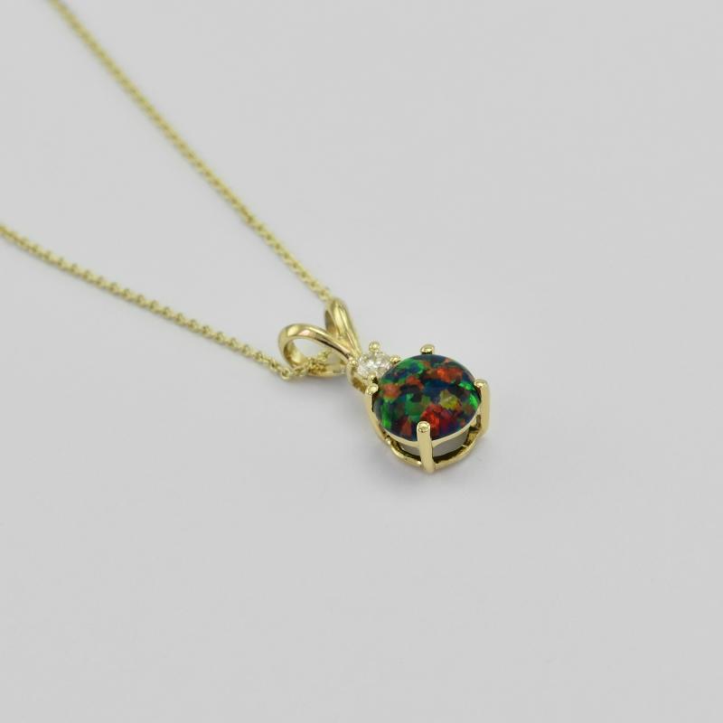 • runde Opale als Cabochon zieren Ohrstecker und einen Anhänger, welcher drei runde Diamanten beim Aufhänger hat