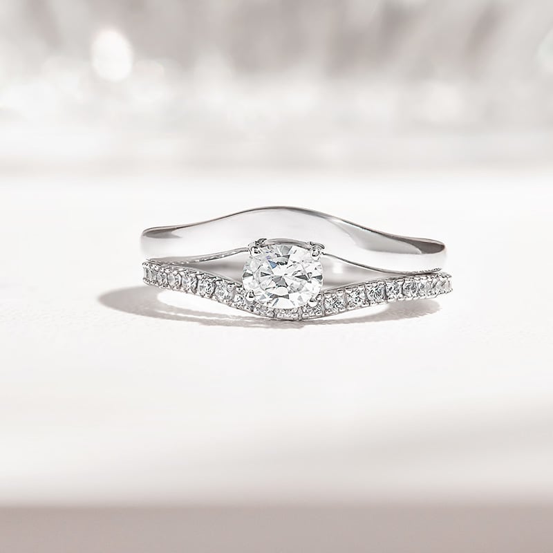 • Set aus sanft geschwungenen Verlobungs- und Eheringen, die einen markant funkelnden Diamanten tragen