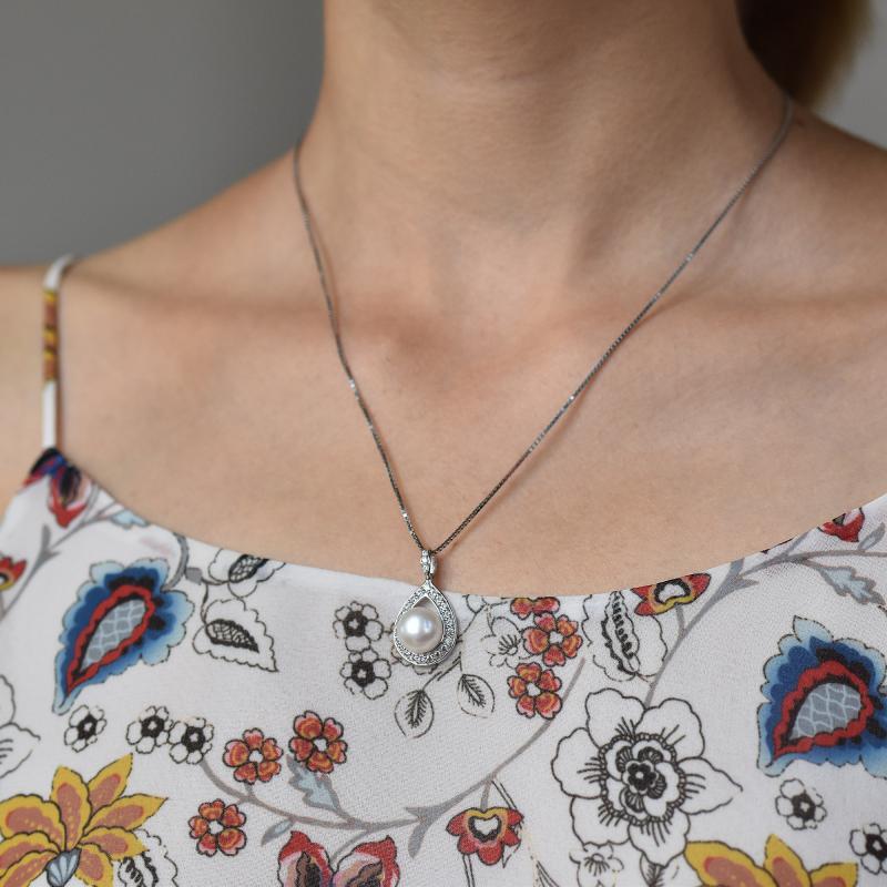 • eine weiße 10 mm große Perle liegt in einer breiten mit Zirkonia besetzten Schlaufe