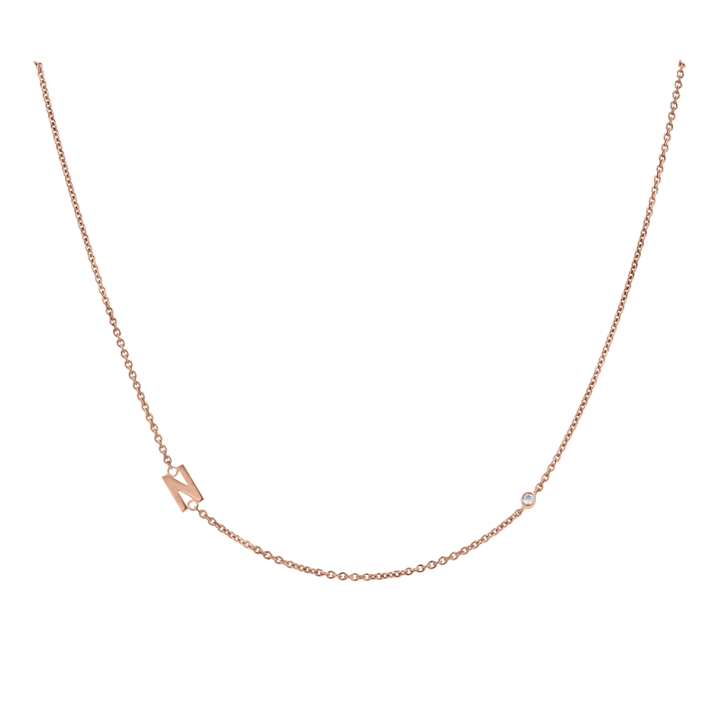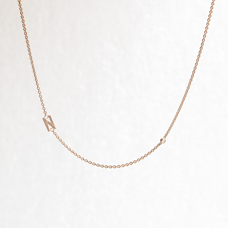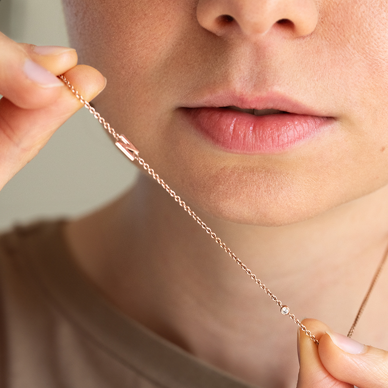• ein Buchstabe Ihrer Wahl und ein funkelnder, im Labor hergestellter Diamant sind an einer zarten Kette befestigt