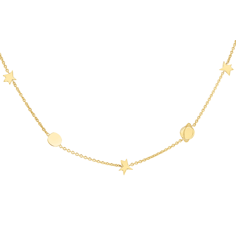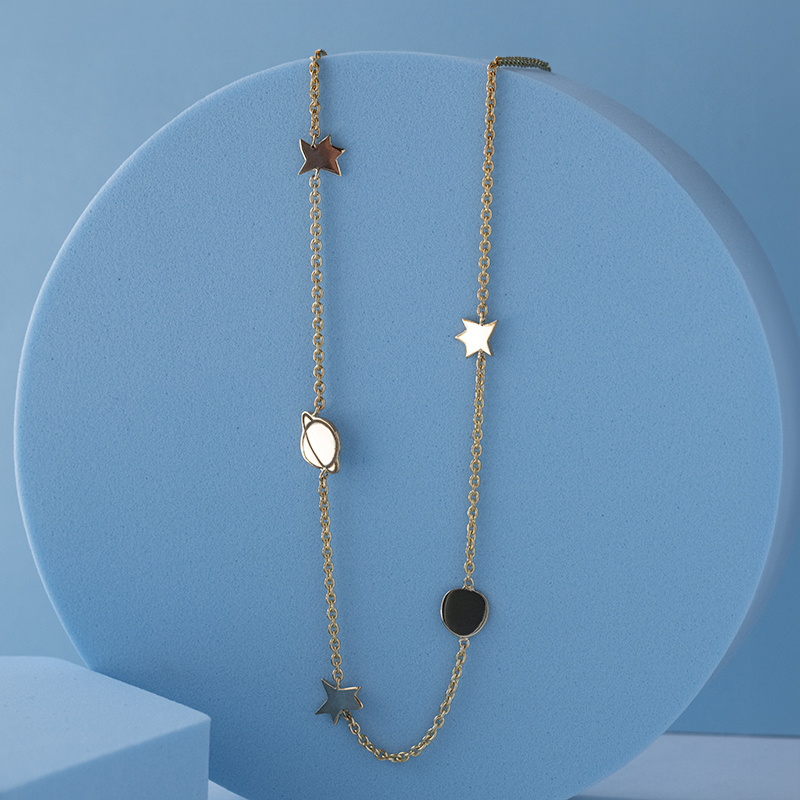 • Anhänger in Form von Sternen und Planeten glitzern anmutig an einer dezenten Kette