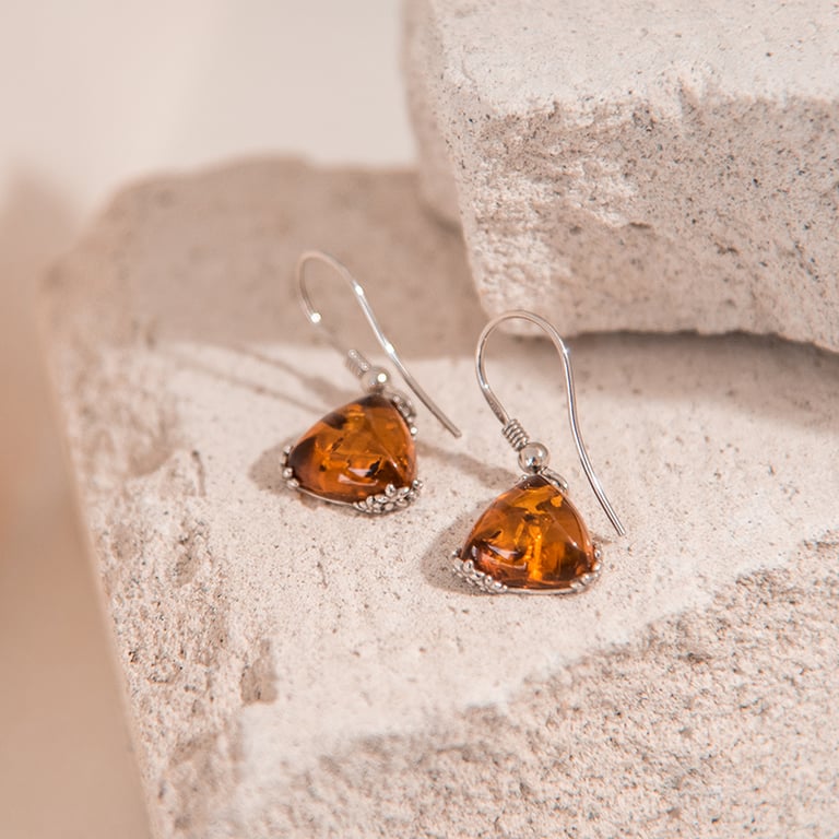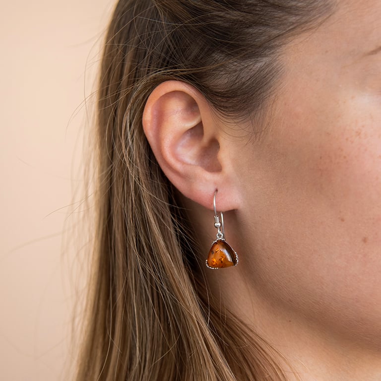 • die Ohrringe werden von Bernsteinen dominiert, die von kleinen Blüten umgeben sind