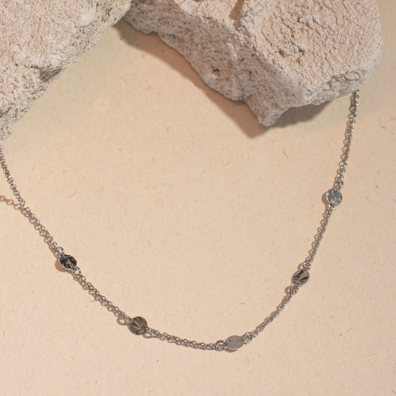 • silberne Kette geschmückt mit zarten Plättchen, die das Licht schön reflektieren