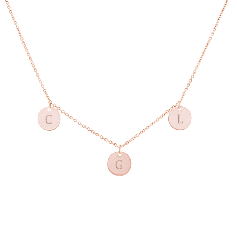 • drei kleine runde Plättchen sind an der Kette befestigt, die mit Buchstaben oder anderen Symbolen graviert werden können