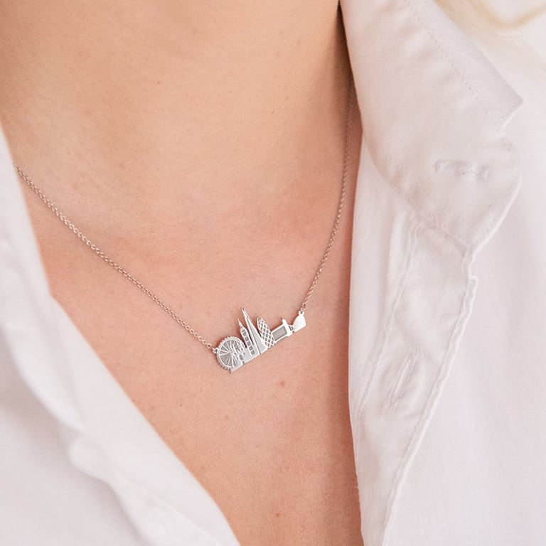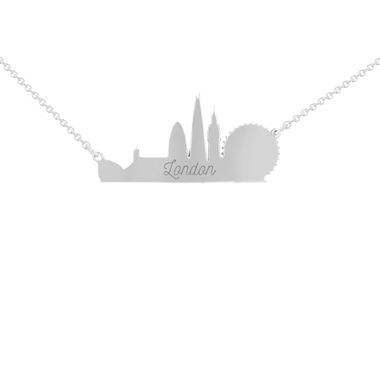• Silberner Anhänger mit der Silhuette der Sehenswürdigkeiten der imposanten Stadt London mit der Möglichkeit einer Gravur