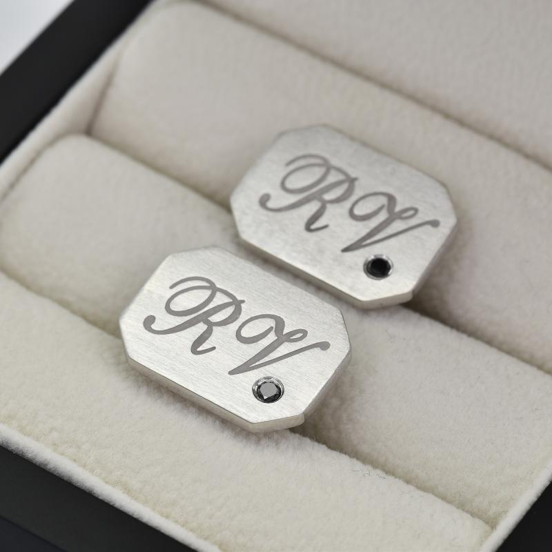 • gravierte Manschettenknöpfe mit schwarzen Diamanten sind ein außergewöhnliches Accessoire