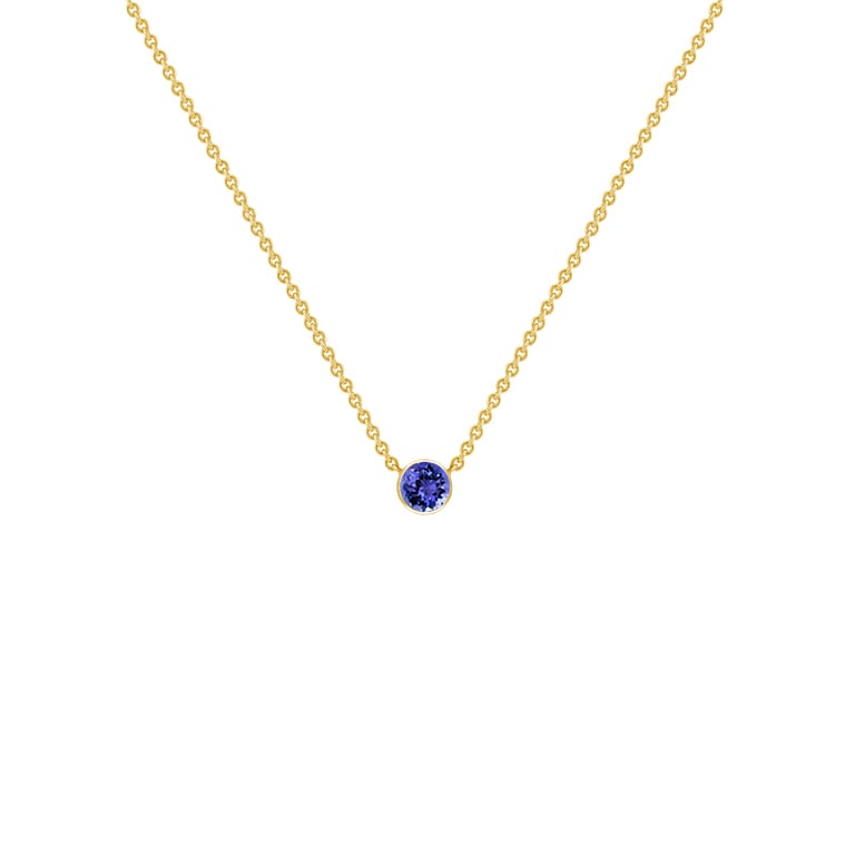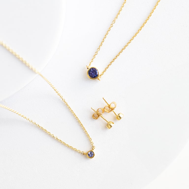 • eine zarte Kette vom Typ Anker mit einem einzigartigen blau-violetten Tansanit verziert