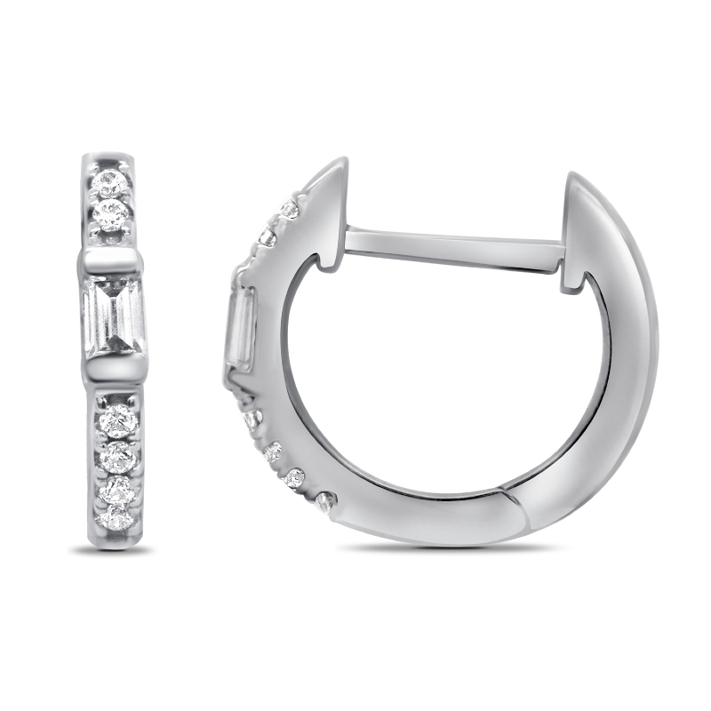 • den Schmuck dominieren zwei Lab Grown Diamanten in Baguette-Form, die von 12 runden Lab Grown Diamanten umgeben sind
