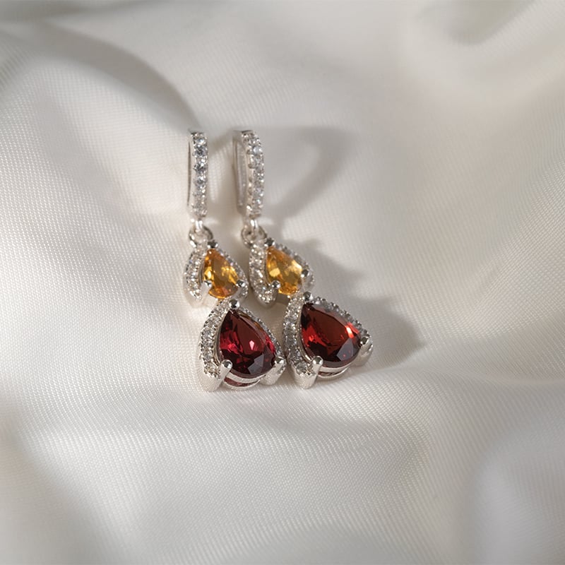 • diese silbernen Ohrringen, die mit gelbem Citrin und einem tiefroten Granat geschmückt sind, werden Sie in einen unwiderstehlichen Glanz hüllen