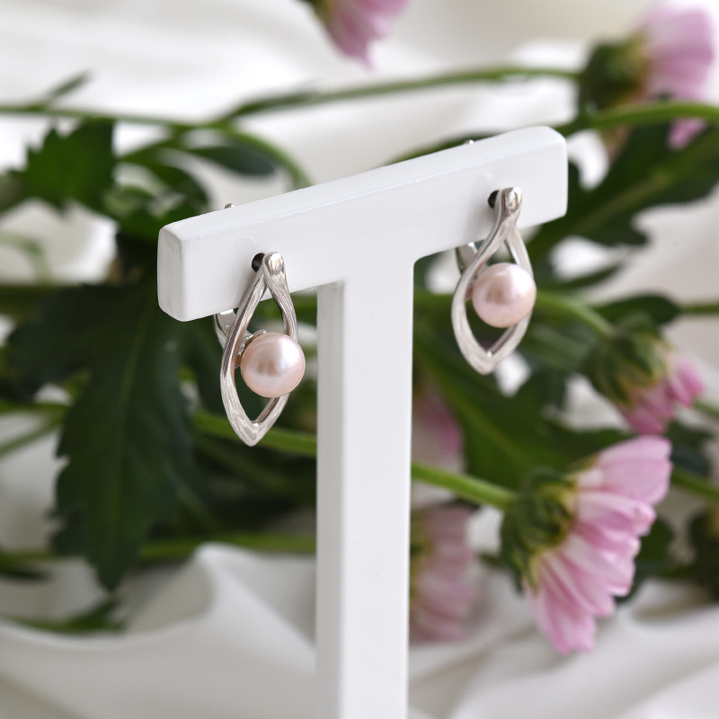 • lavendelfarbene Perlen sitzen in silbernen Ohrringen mit einem außergewöhnlichen Design