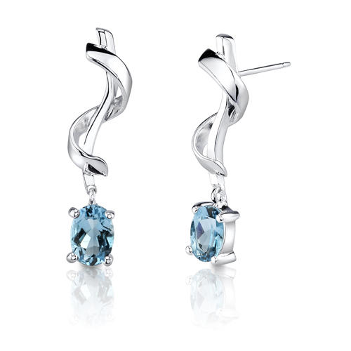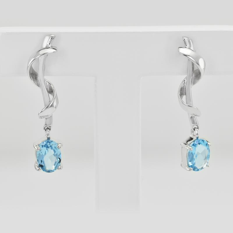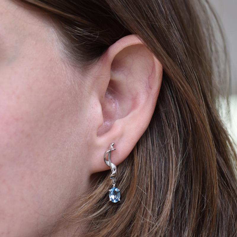 • an einer ausgeklügelten Aufhängung, die an Blitze erinnert, hängt jeweils ein ovaler Topas in Schweizer Blau