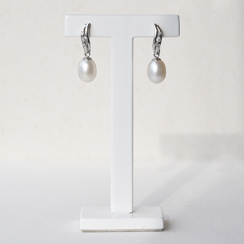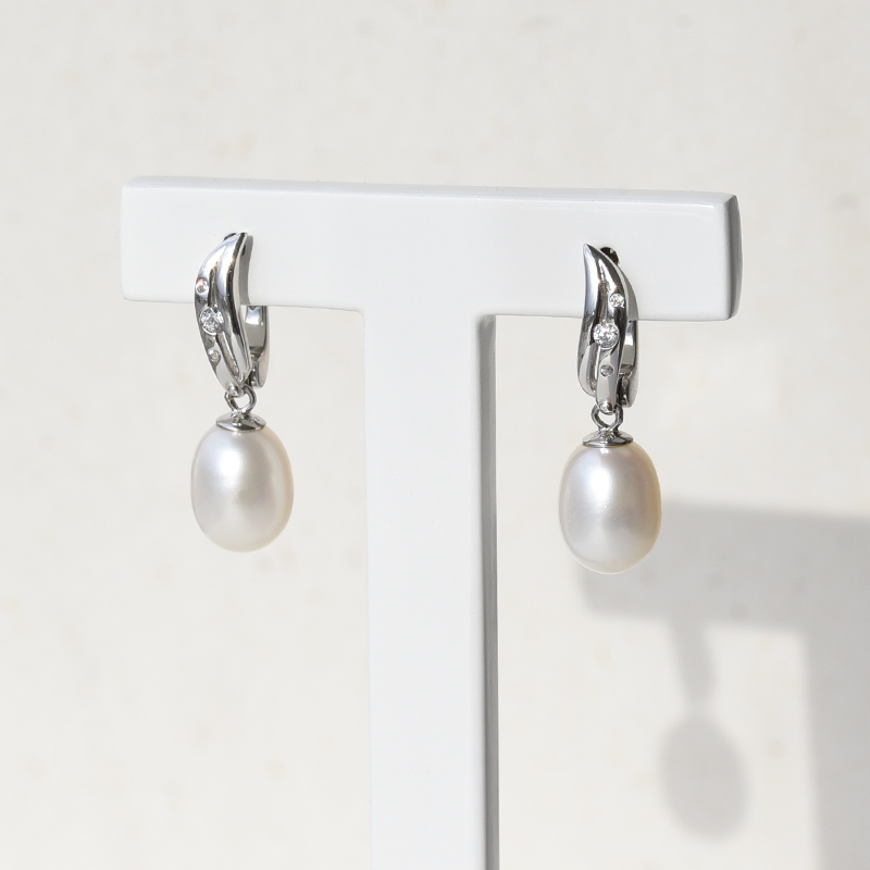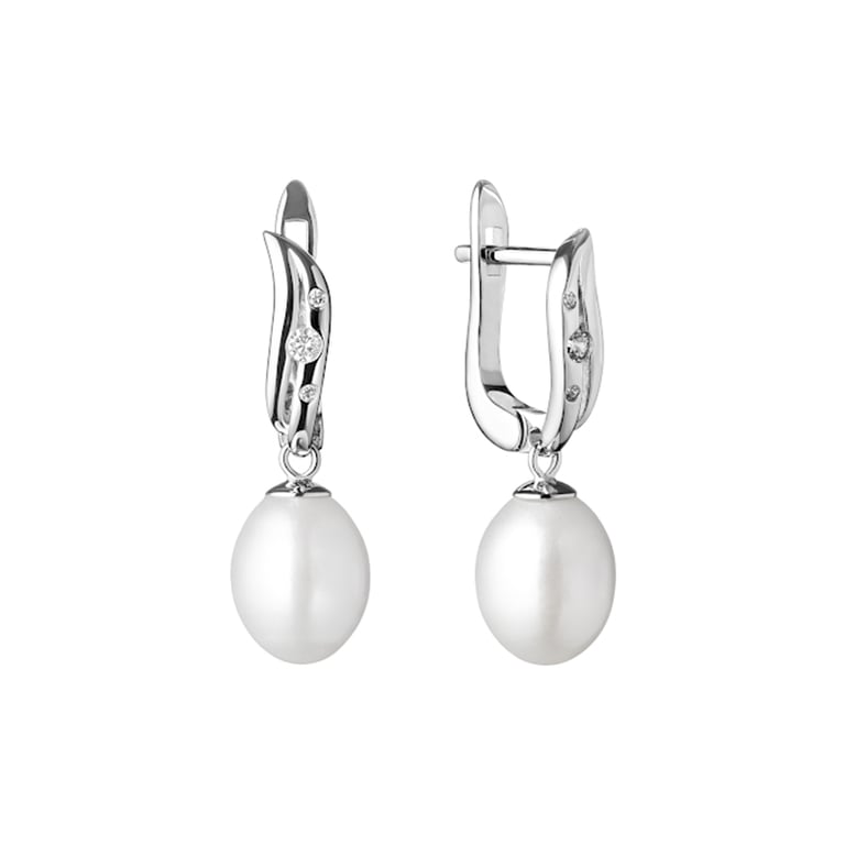 • die Hängeohrringe aus Silber werden von weißen Perlen dominiert, die durch kleine Zirkonia ergänzt werden