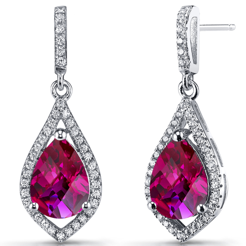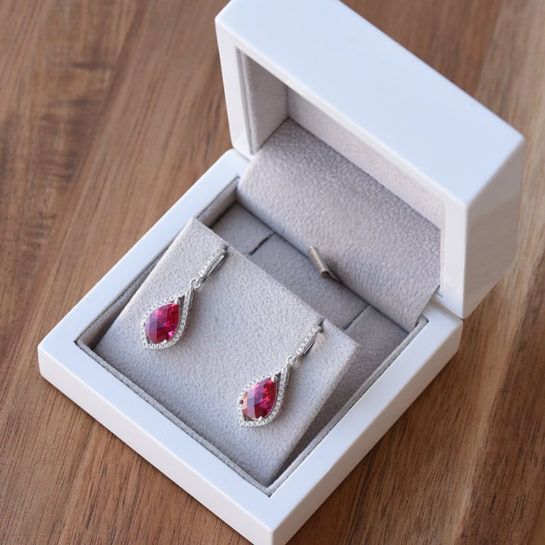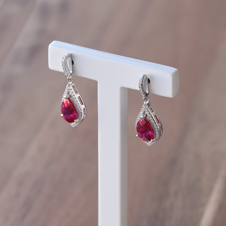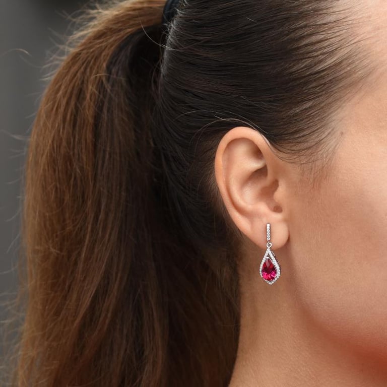 • blutrote, tropfenförmige Rubine sind umrahmt von einem spitzen silbernen Oval, besetzt mit Zirkonia
