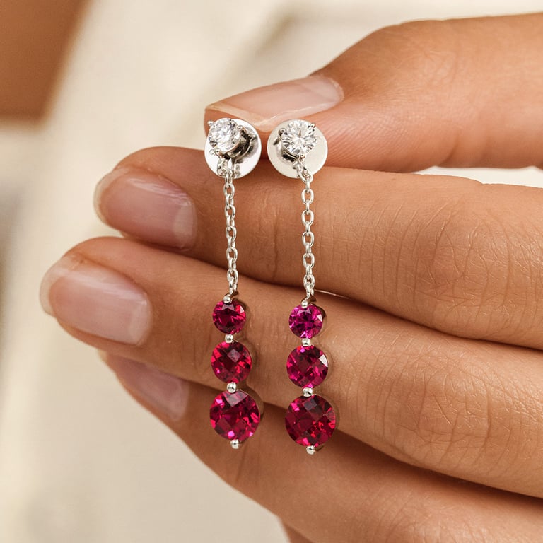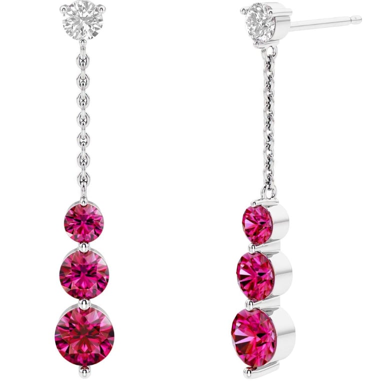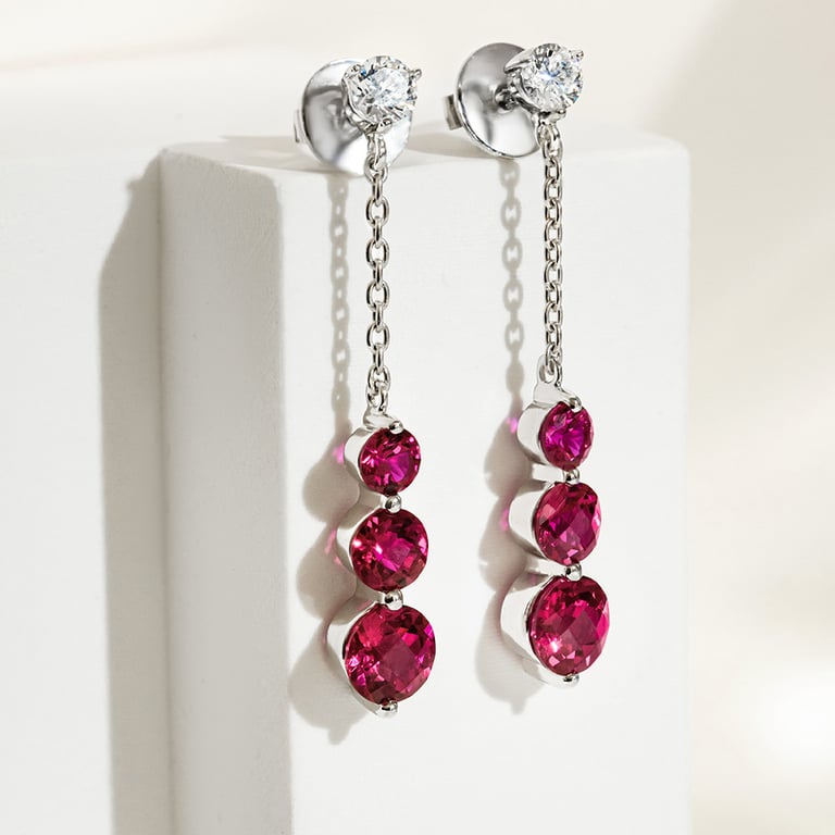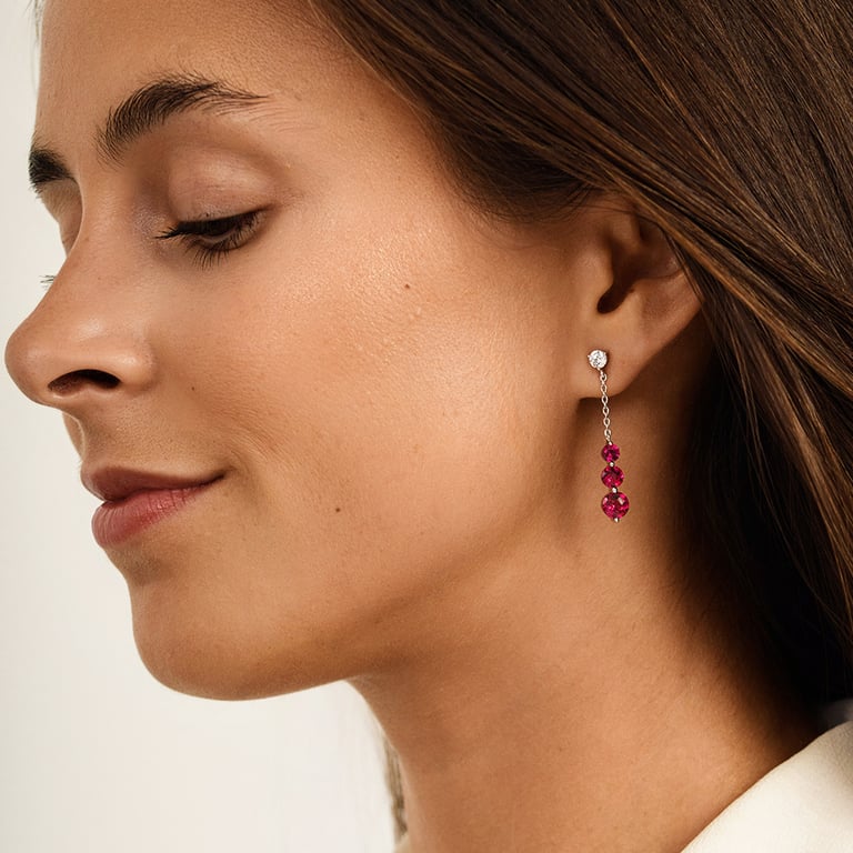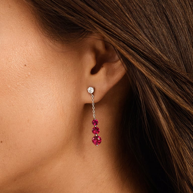 • jeder Ohrring ist mit drei Rubinen und einem weißen Zirkon verziert