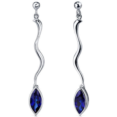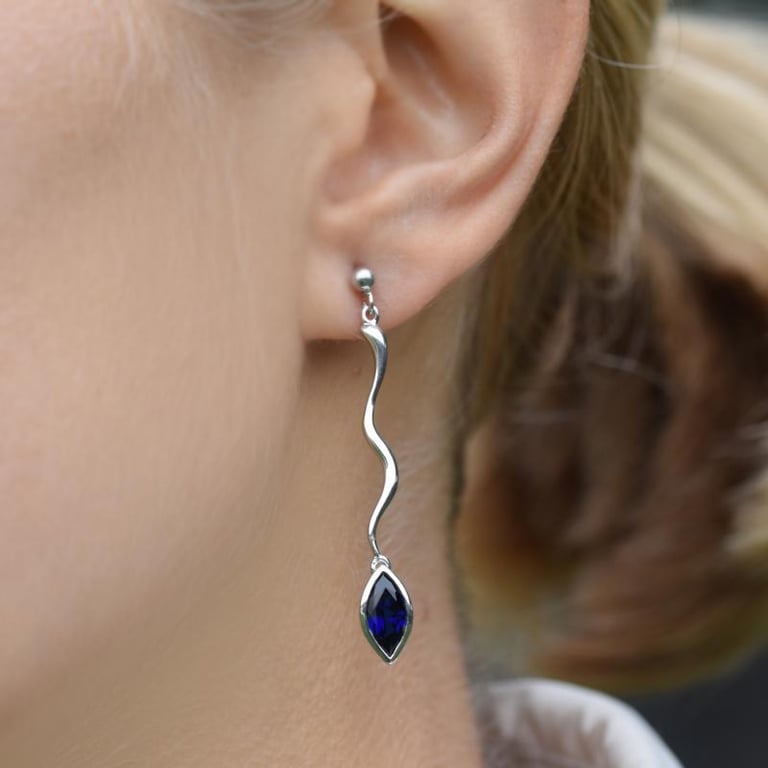 • tiefblaue Saphire in Marquiseform hängen an wellenförmigen Silberstäben