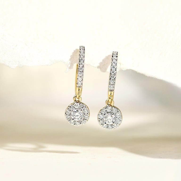 • bestechen durch den Glanz des zentralen runden Diamanten, der an den Ohrringen hängt