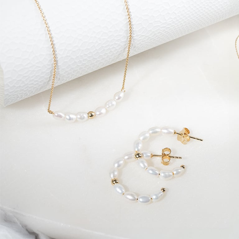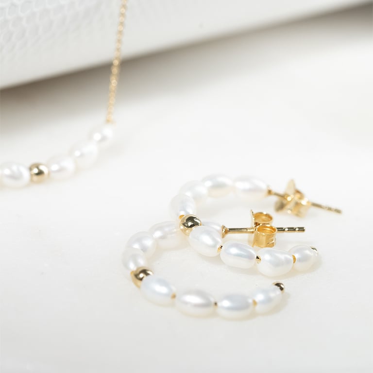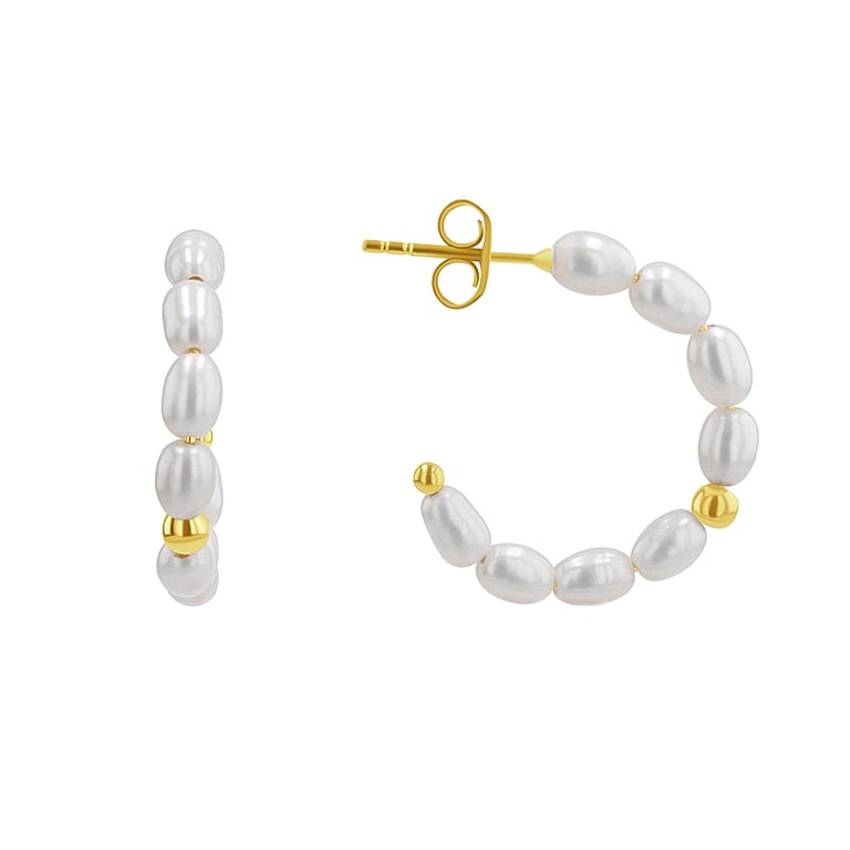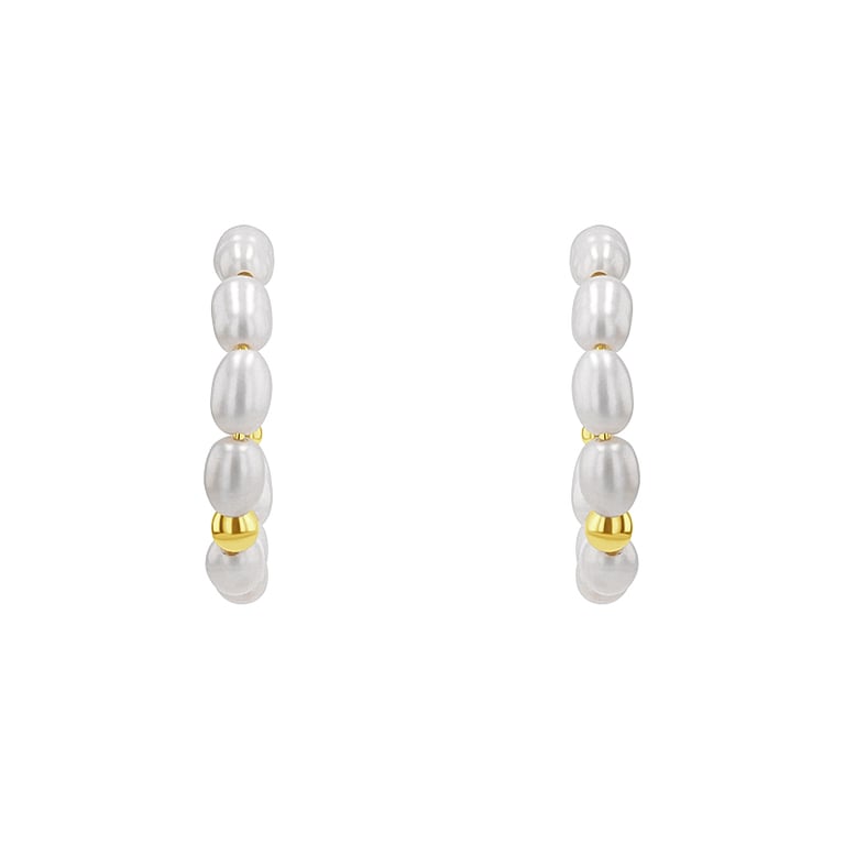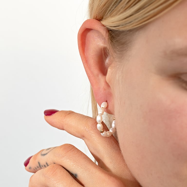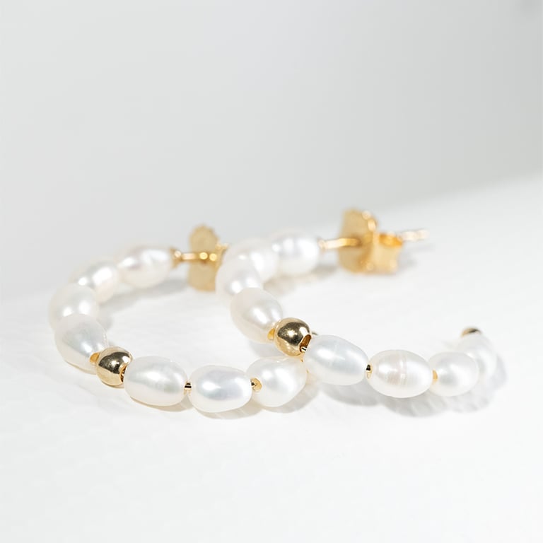• jeder Ohrring besteht aus einer Reihe natürlicher Perlen, die durch eine runde vergoldete Perle akzentuiert werden