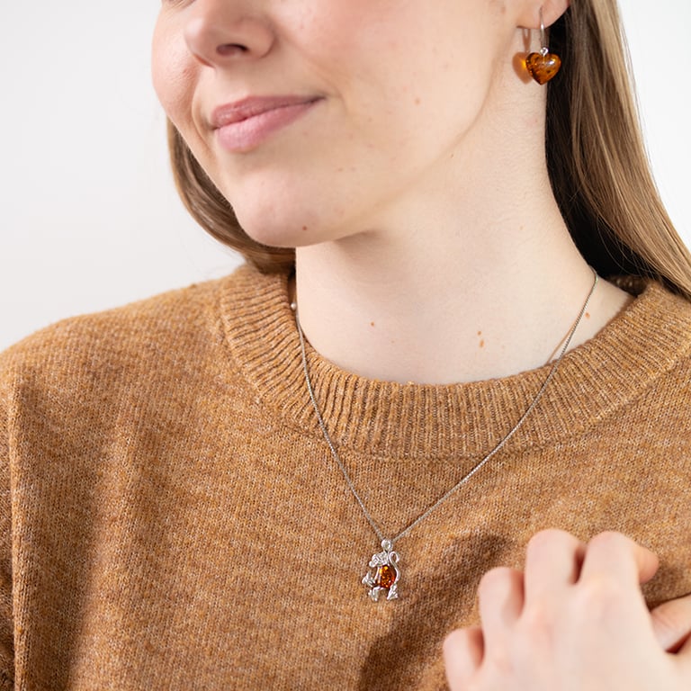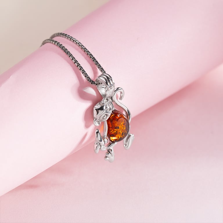 • Anhänger in Form eines fröhlichen Äffchens, dessen bernsteinfarbener Körper die warmen Sonnenstrahlen reflektiert