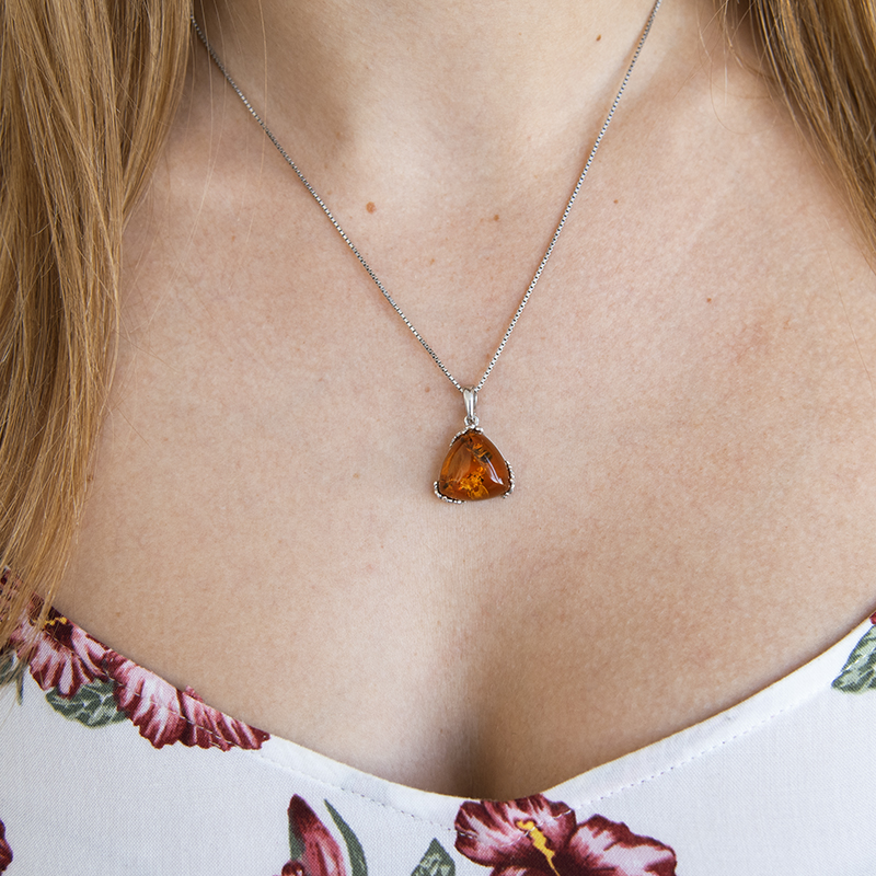 • er wird von einem natürlichen cognacfarbenem Bernstein dominiert, der von kleinen silbernen Blüten umgeben ist