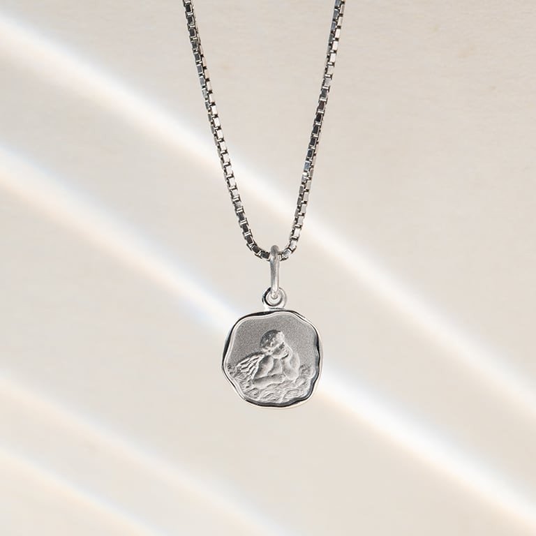 • Anhänger in Form einer unregelmäßigen Münze mit dem Motiv eines Engels