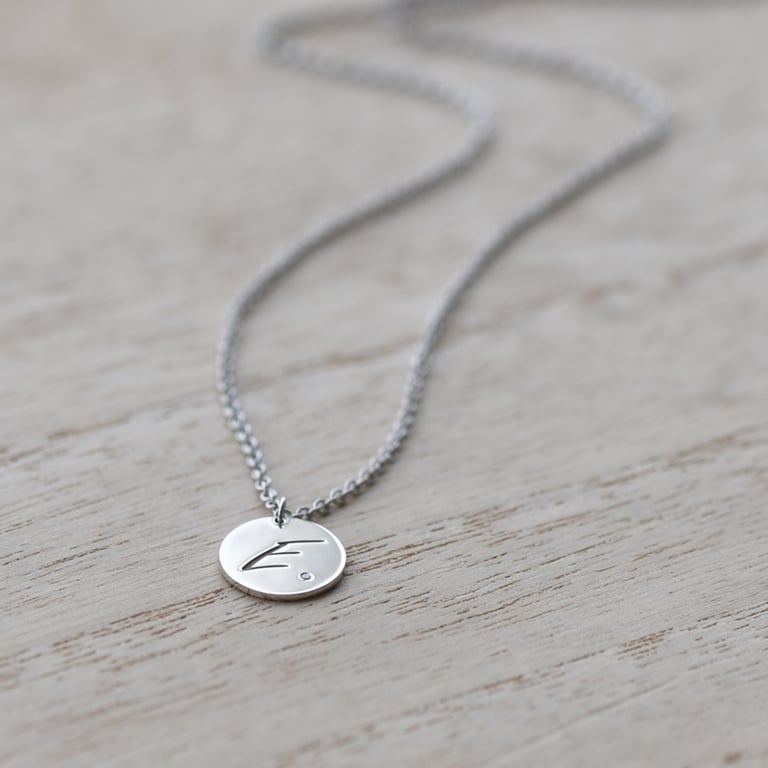 Silberner Anhänger mit Diamant und Gravur eines Buchstabens Sager