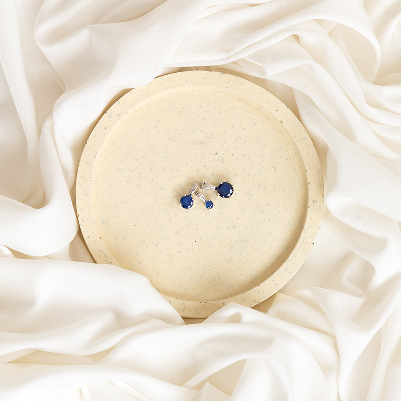 • ein schlichter Anhänger aus recyceltem Silber, besetzt mit einem natürlichen Saphir