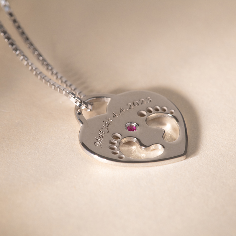 • ein silberner Anhänger in Herzform mit Kinderfüßchen, einem eingesetzten Edelstein nach Wunsch und Gravur