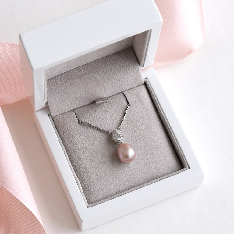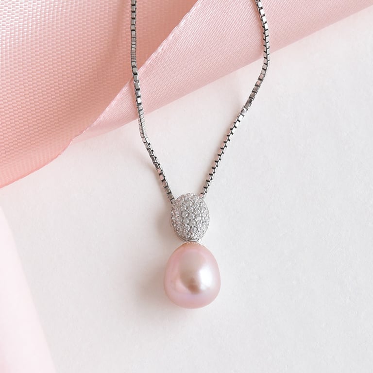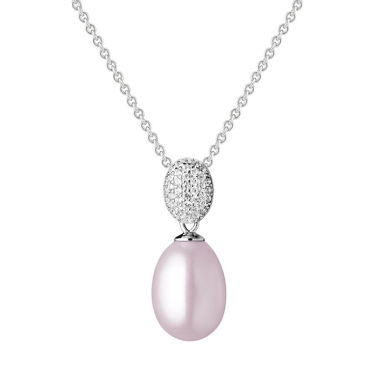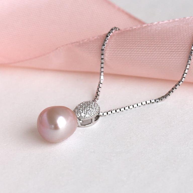 • die wunderschöne Perle wird mit ihrer besonderen Lavendelfarbe und glänzenden Zirkonia sowie einer silbernen Kette die Blicke auf sich ziehen
