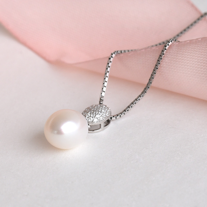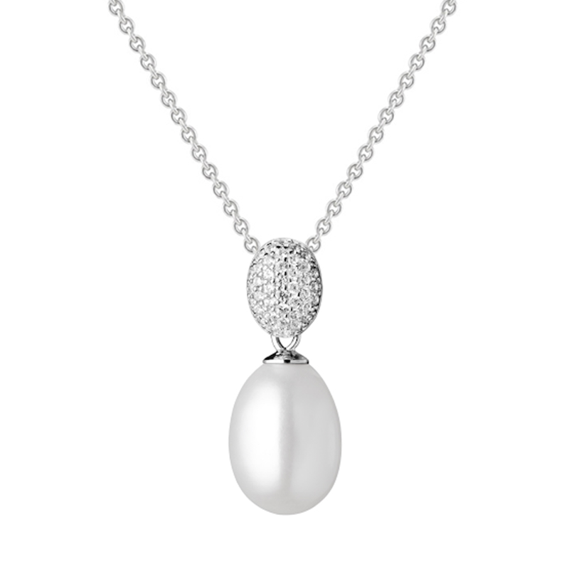 • eine klassische Silberkette geschmückt mit einer Perle, die von kleinen, funkelnden Zirkonia eingerahmt ist