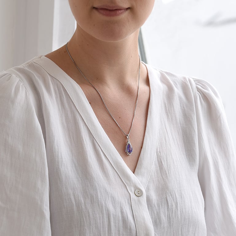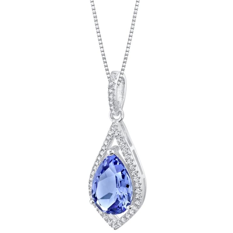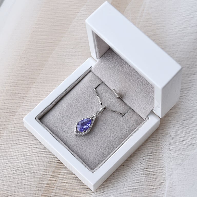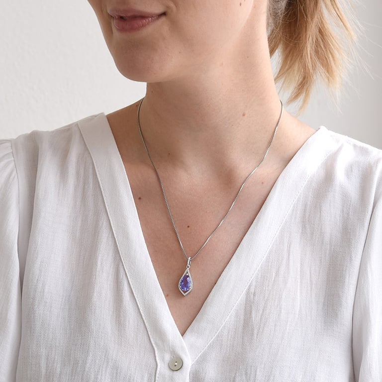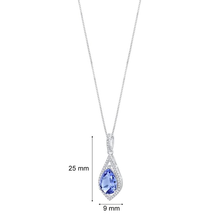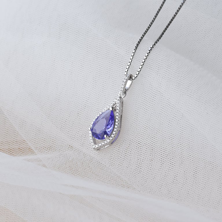 • der Tansanit ist als Träne geschliffen, die von einem Halo aus Zirkonia in Form eines spitzen Ovals umgeben ist, die ihm zusätzliches Feuer verleiht