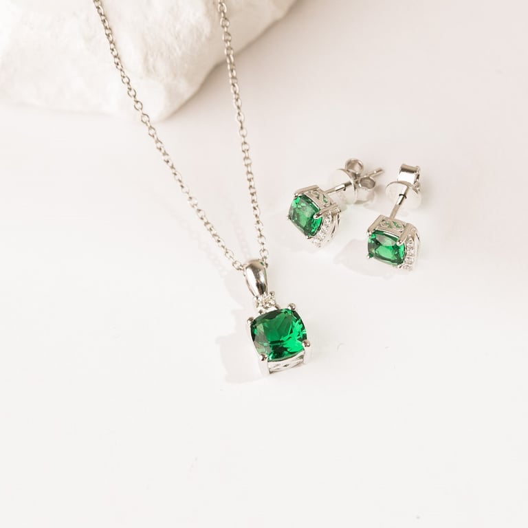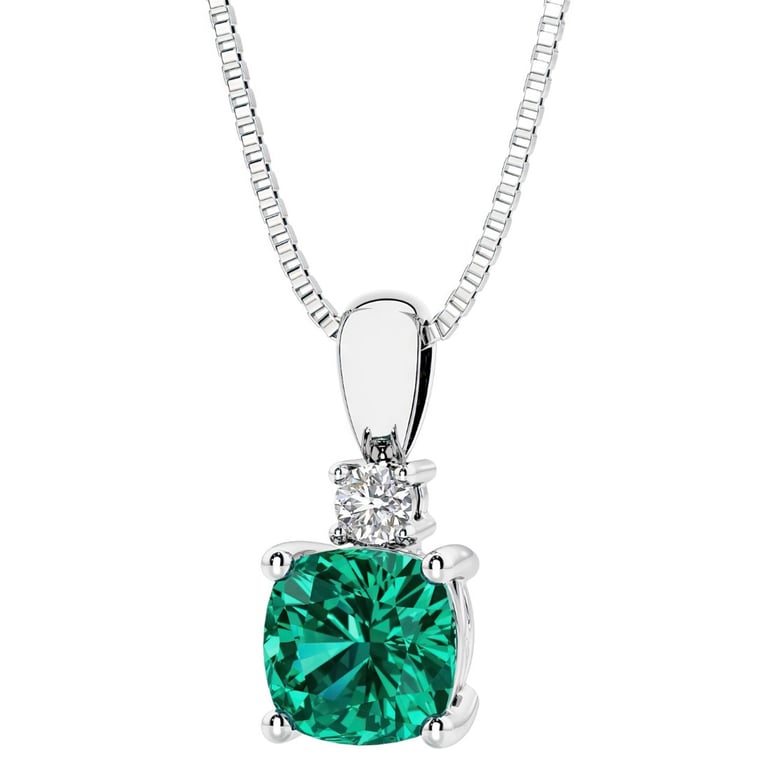 • der elegante silberne Anhänger mit einem leuchtenden Smaragd