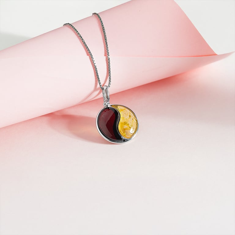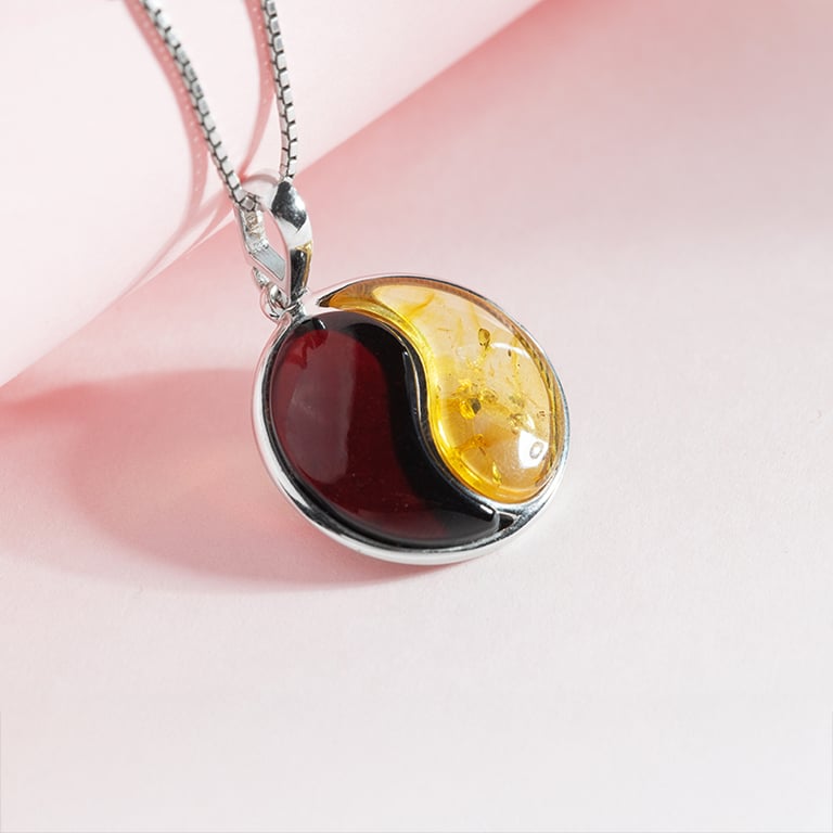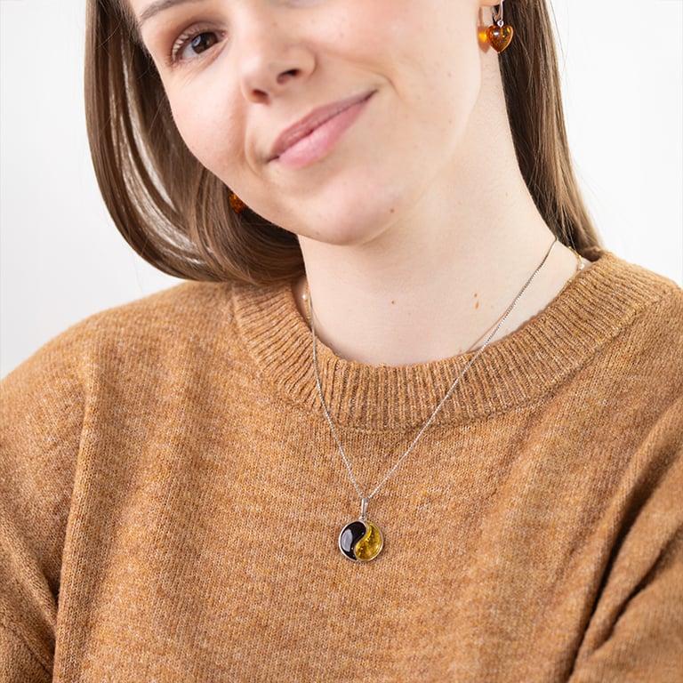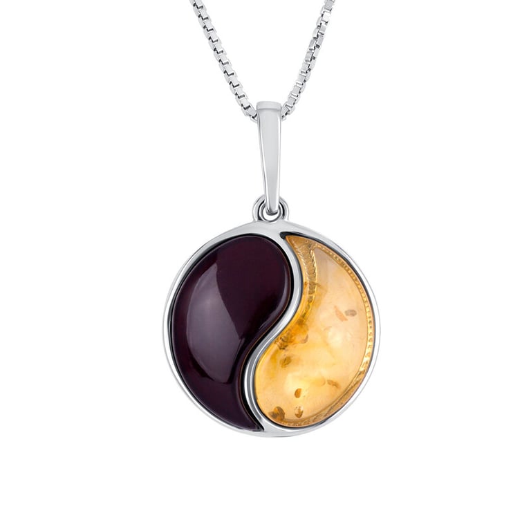 • Silberanhänger mit ikonischem Yin-Yang-Symbol, ergänzt durch Naturbernstein