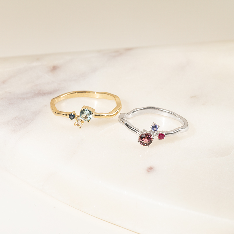 • den ungleichmäßig geschmiedeten Ring zieren vier Edelsteine
