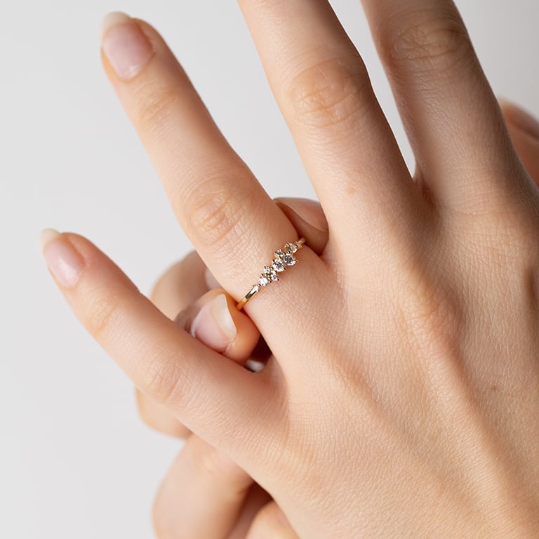• eleganter Clusterring, auf dem eine harmonisch angeordnete Gruppe von Moissaniten glänzt