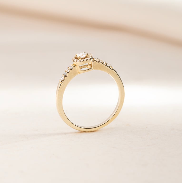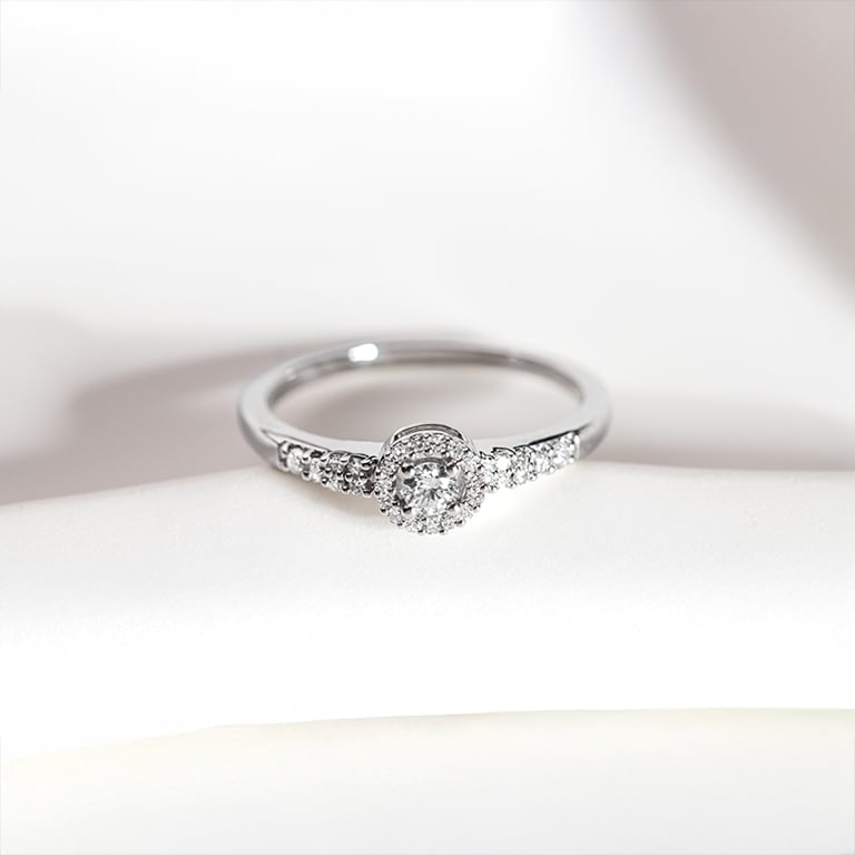 • ein außerordentlicher und zarter Diamantring im beliebten Halo-Stil