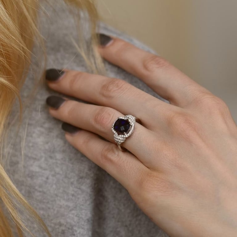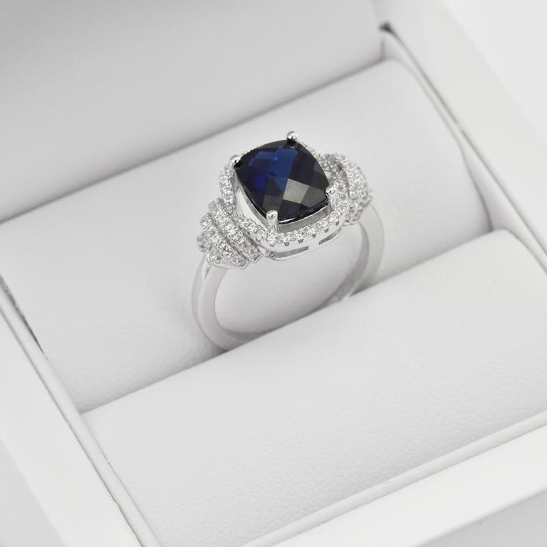 • romantischer silberner Ring mit dunkelblauem Saphir und Zirkonia