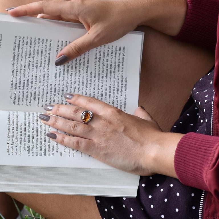 • ein auffälliger Silberring mit großem zentralen Bernstein