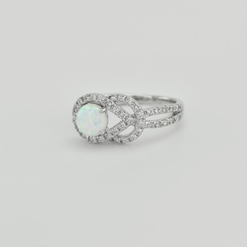 • auf einer geteilten und um den in vielen Farben schillernden Opal gewundenen Ringschiene funkeln 48 Zirkonia