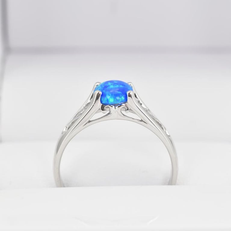 • der runde blaue, schillernde Opal wird wie von vier Krappen von der geteilten Ringschiene gehalten