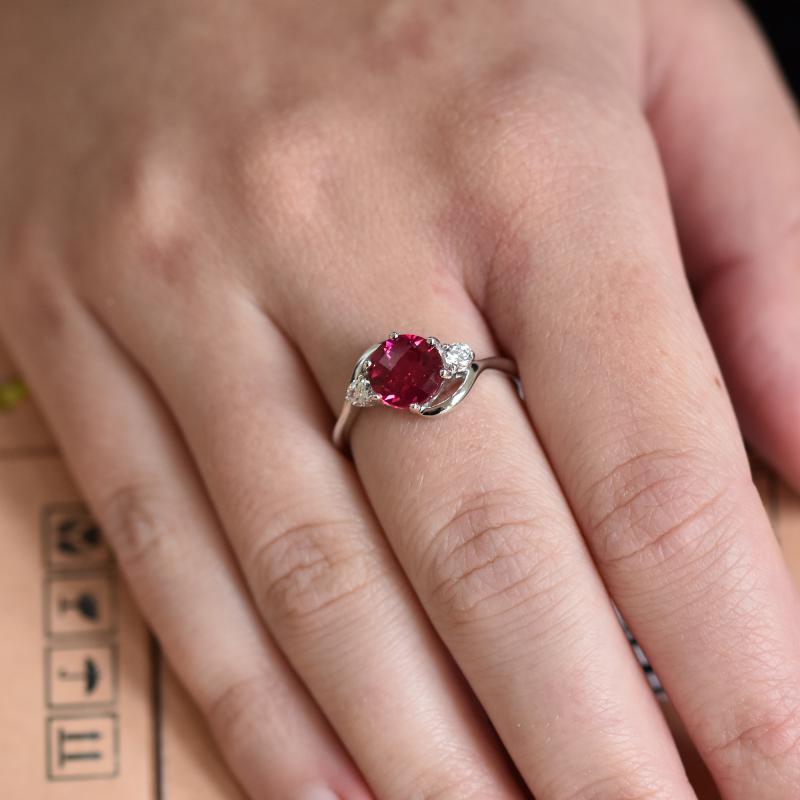 • zwei rundgeschliffene Zirkonia als Seitensteine ergänzen den ebenfalls runden Rubin
