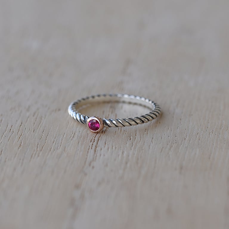 • der runde leuchtende Rubin ist in eine vergoldete Zarge gefasst