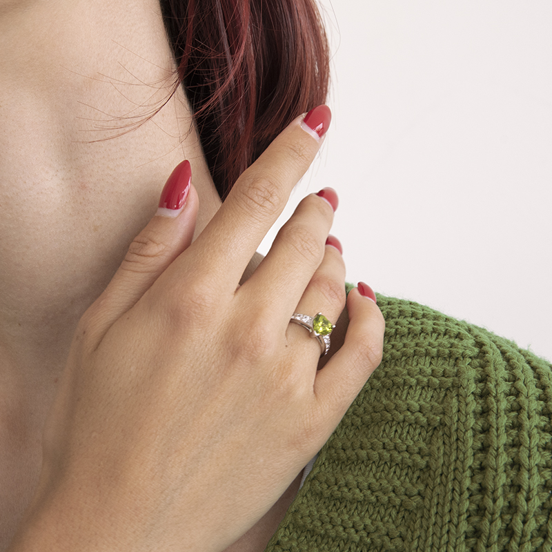 • silberner Ring besetzt mit Zirkonen und einem Olivin in Herzform