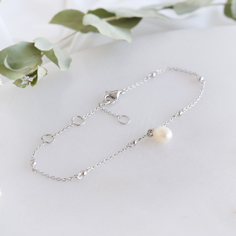 • zarte Kette, die von einer weißen Perle und 6 kleinen silbernen Kügelchen geschmückt wird