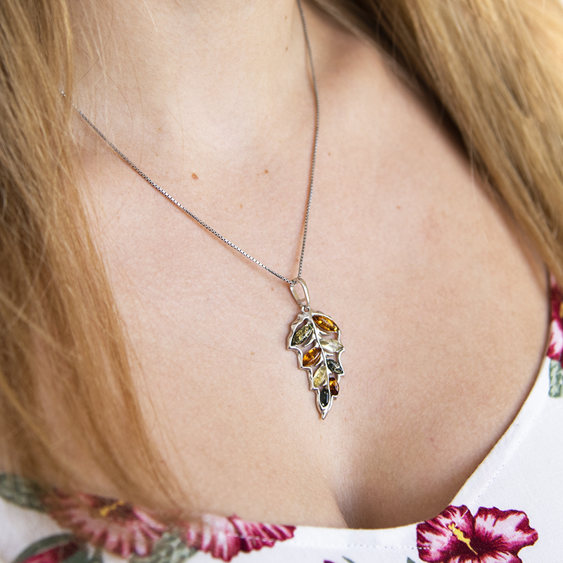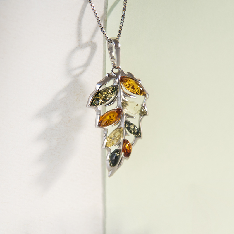 • 8 natürliche Bernsteinstücke in Cognacfarben, in Honiggelb und in Olivgrün zieren das Blatt