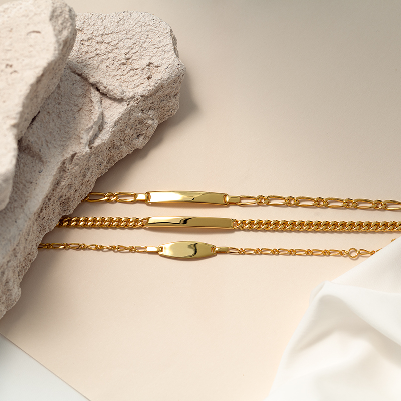 • das Armband bildet eine Figarokette, die aus drei runden Ösen im Wechsel mit einer länglichen besteht