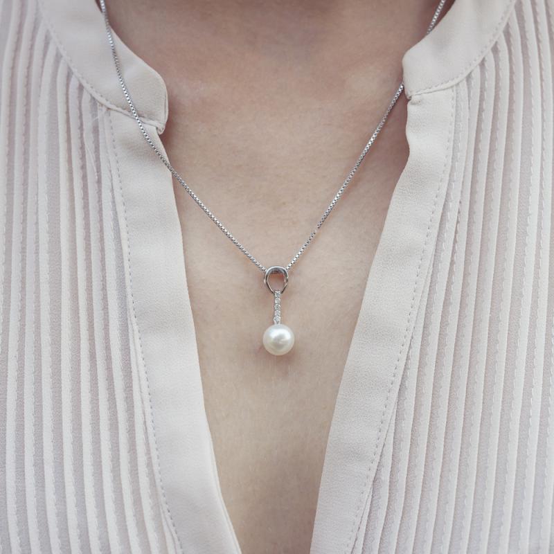 • jeweils eine weiße Perle hängt an einer funkelnden, mit Zirkonia besetzten Kette